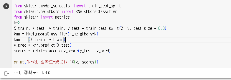 - KNN 알고리즘을 사용하기 위해 KNeighborsClassifier 모듈을 호출하고, fit을 이용해서 훈련시키고 모형을 설정