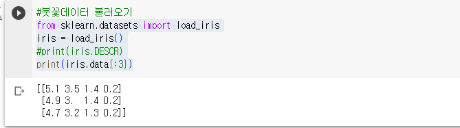- load_iris() 명령으로 iris데이터를 불러오고, iris data를 출력