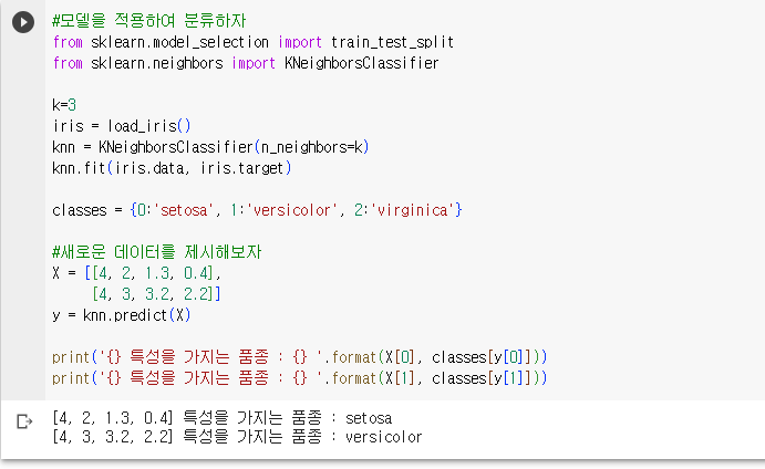 - 모델에 적용을 하면 첫 번째 데이터는 setosa, 두 번째 데이터는 versicolor로 예측함