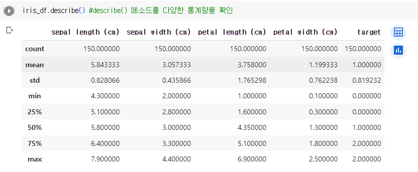 - describe() : 계량형 데이터의 통계량(요약)을 확인할 수 있음