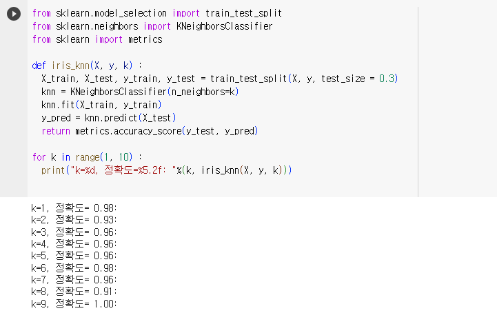 - train_test_split 함수를 사용하여 훈련데이터와 검증데이터로 구분함. X, y라는 데이터에서 X_train, X_test, y_train, y_test로 홀드아웃(테스트용, 훈련용)으로 분류함