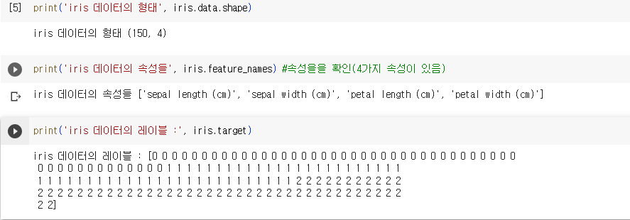iris데이터는 5개의 속성을 가지는데 4개는 iris.data와 다섯 번째 0,1,2 소속 클래스의 값을 갖는 target 속성임(target이 학습에서 사용되는 목푯값)