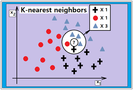 K-nearest neighbors(K-최근접 이웃) 알고리즘은 주변의 가장 가까운 K개의 데이터를 보고 데이터가 속할 그룹을 판단하는 알고리즘임. K-NN 알고리즘은 이미지 처리, 글자/얼굴 인식, 추천 알고리즘, 의료 분야 등에서 많이 사용됨