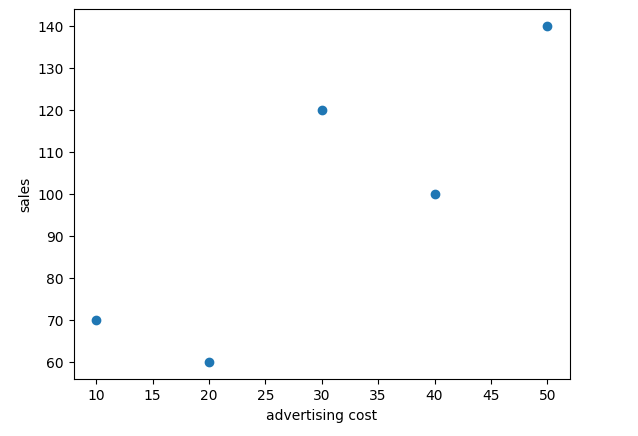- 두 변수 간의 관련성을 확인하기 위한 그림입니다. matplotlib.pyplot 라이브러리를 import 하여 산점도를 작성하였고, 그 결과는 광고비와 매출액에 대한 산점도 그림과 같고, 광고비가 증가하면 매출액이 증가하는 관계를 확인할 수 있습니다.