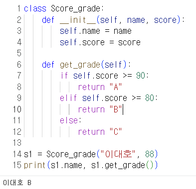 Score_grade 클래스는 현실 세계의 개념을 코드로 추상화한 모델이고, 내부 계산하는 기능은 숨기고 get_grade()만 제공하므로서 필요한 경우 객체를 호출해서 사용할 수 있다.