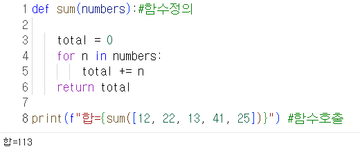 함수로 정의하면 함수내부에 어떻게 계산하는지 숨길 수 있고, 무엇을 하는지만 함수이름으로 표현할 수 있다. sum() 함수는 합을 계산하는 기능을 가지고 있어, 필요할 때 호출해서 사용하면 된다.