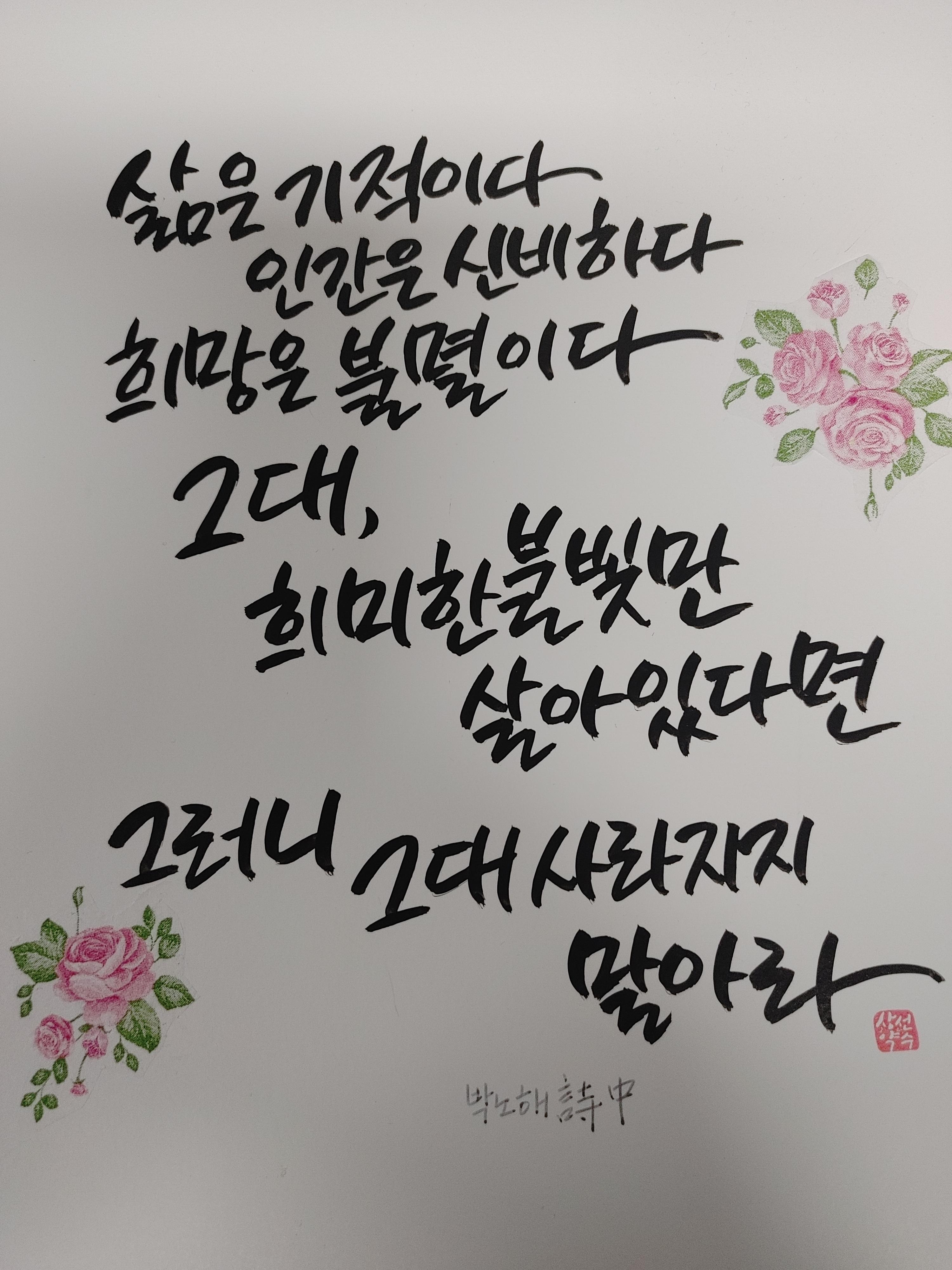 박노해 시 - 그러니 그대 사라지지 말아라- 더불어 함께 가는 세상은 왜 이리 힘든가? 며칠 우울하여 박노해 시가 생각나서 오래간만에 캘리작업을 했다. 실오라기 같은 불빛이라도 있다면 희망이라 생각한다 22.3.13 My Life 2022.03.13